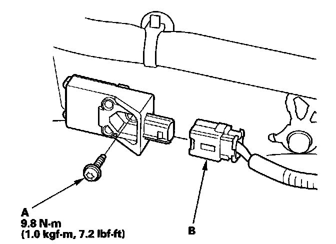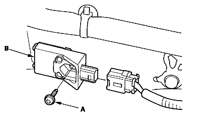 1. Install the new side impact sensor (first) with the TORX bolt (A), then connect the floor wire harness 2P connector (B) to the side impact sensor (first).