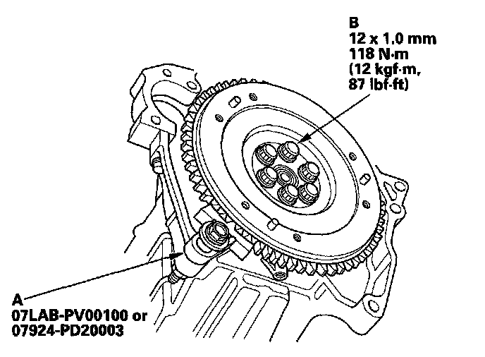 FlywheelTorque the flywheel mounting bolts (B) in a crisscross pattern in several steps.