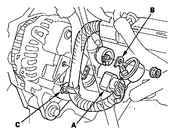 5. Disconnect the alternator connector (A), the BLK wire (B) and the harness clamp (C) from the alternator.