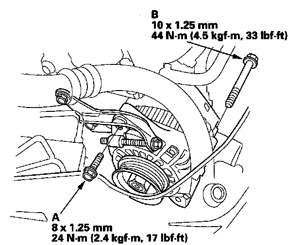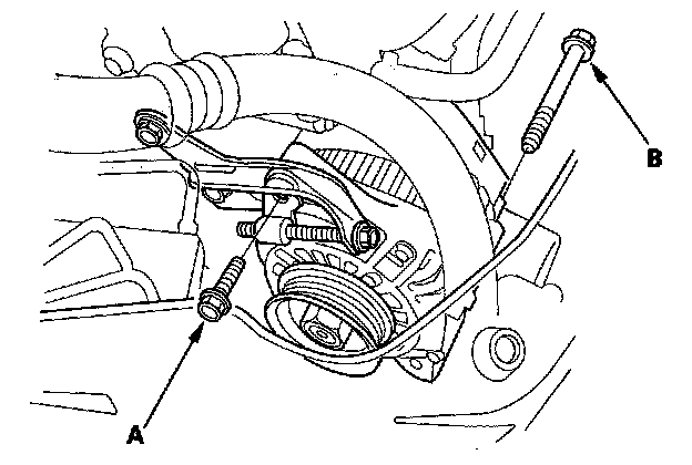 1. Install the alternator, then loosely install the lock bolt (A) and the mounting bolt (B).