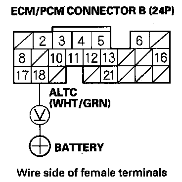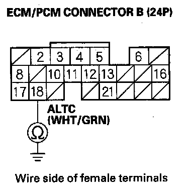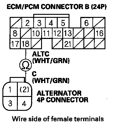 12. Check for continuity between ECM/PCM connector terminal B18 and alternator 4P connector terminal No. 2.
