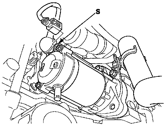 8. Make sure the shift lever is in the N or P position (A/T) or neutral (M/T) and set the parking brake. Disconnect the connector from the starter solenoid S terminal. Connect a jumper wire from the battery positive terminal to the solenoid S terminal.