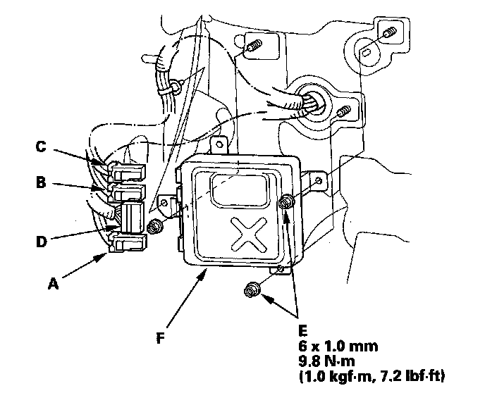 6. Remove the nuts (E) from the EPS control unit (F).