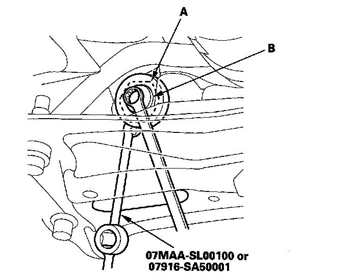 2. Loosen the rack guide screw locknut (A) with the locknut wrench, then remove the rack guide screw (B).