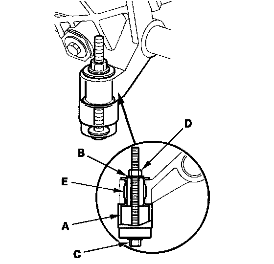 2. Position a 34 mm socket wrench (A) on the flange part of the gearbox housing with a washer (B), a 10 x 105 mm flange bolt (C) and a 10 mm nut (D) as shown.