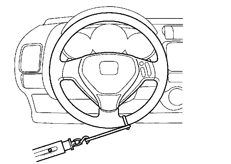 2. Attach a commercially available spring scale to the steering wheel. With the engine idling and the vehicle on a clean, dry floor, pull the scale as shown, and read it as soon as the tires begin to turn.