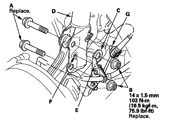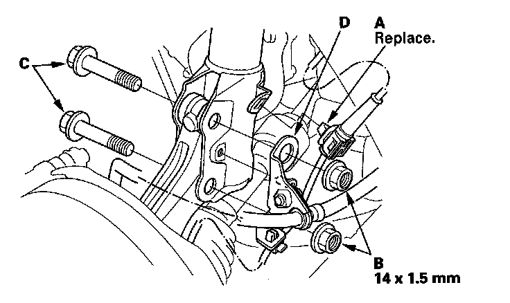 3. Loosely install new damper pinch bolts (A) and new flange nuts (B) with the brake hose bracket (C) to the damper (D).