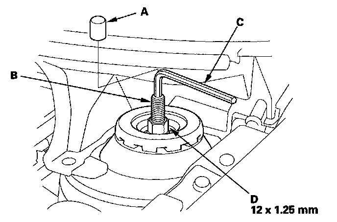7. Hold the damper shaft (B) using a hex wrench (C), and loosen the 12 mm nut (D).
