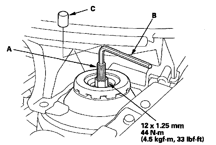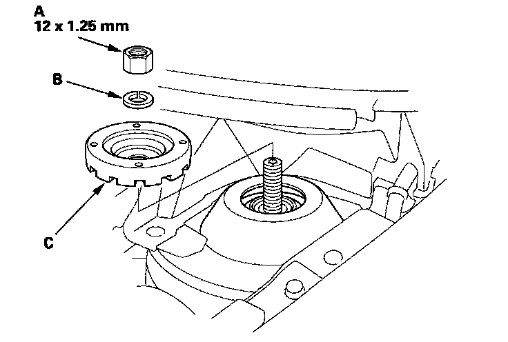 2. Install the damper mounting base (A) and the wave washer (B), then loosely install the 12 mm nut (C).