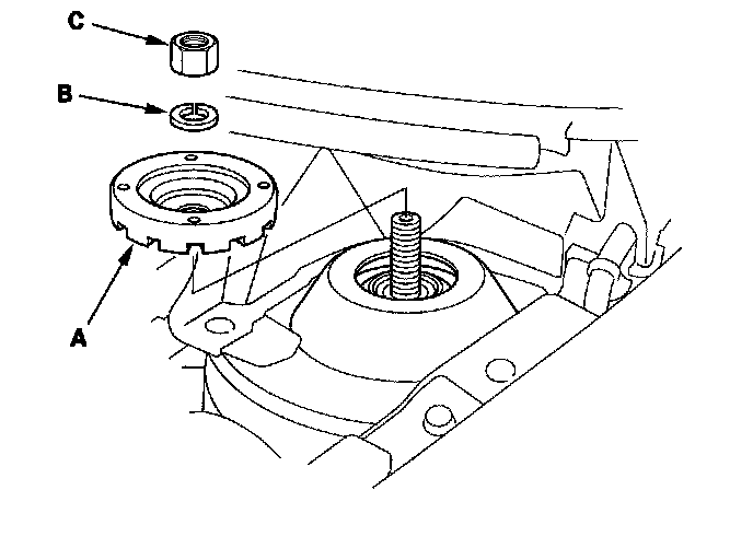 8. Remove the 12 mm nut (A) and the wave washer, (B), then remove the damper mounting base (C) from the body.