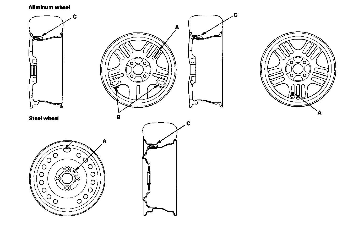 TPMS will not work unless TPMS type wheels are installed on the vehicle. The original equipment wheels have a "TPMS" mark (A) on them and counterweights (B) cast into the opposite side of the spoke to counter balance the weight of the tire pressure sensor (C).