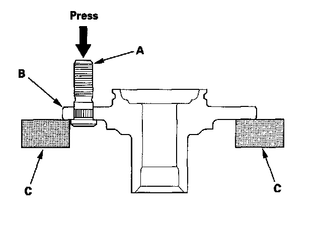 2. Separate the wheel bolt (A) from the hub (B) using a hydraulic press. Support the hub with hydraulic press attachments (C) or equivalent tools.