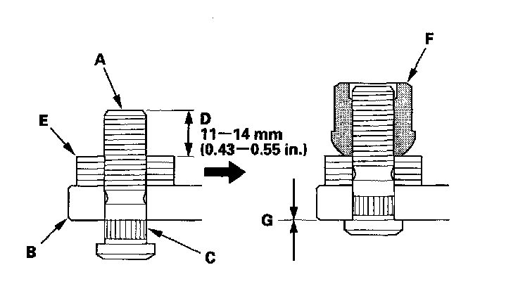 3. Insert the new wheel bolt (A) into the hub (B) while aligning the splined surfaces (C) on the hub hole with the wheel bolt. Adjust the measurement (D) with washers (P/N 94101-12800 or equivalent) (E), then install a nut (P/N 90304-SC2-000 or equivalent) (F) hand-tight.
