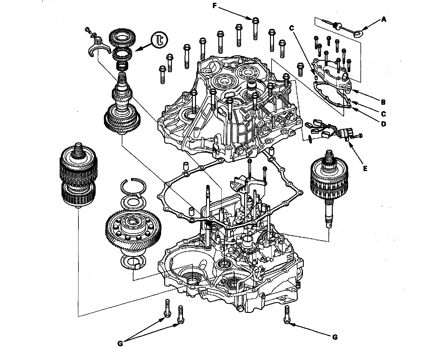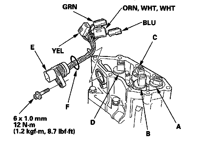 18. Install the shift solenoid harness connector (E) with the new O-ring (F) in the transmission housing.