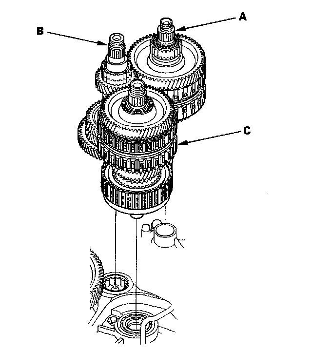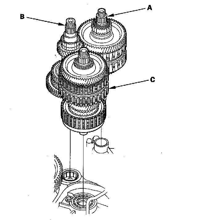 6. Join the mainshaft subassembly (A), countershaft subassembly (B), and secondary shaft subassembly (C) together, and install them in the torque converter housing.