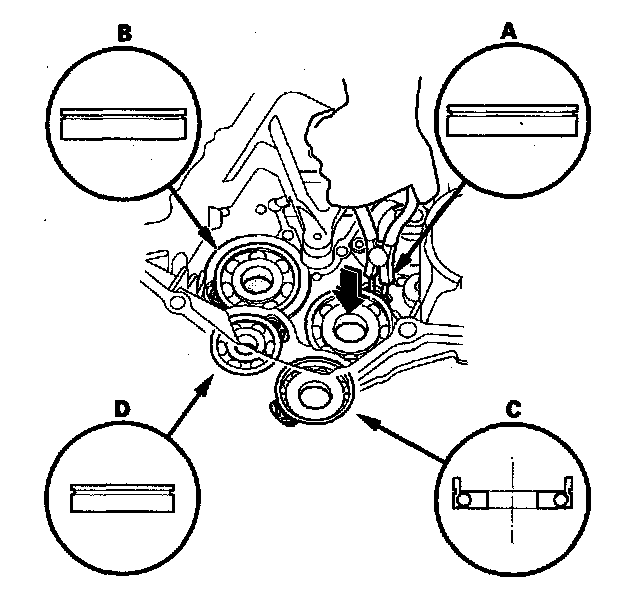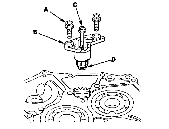 1. Remove the snap ring (A), the cotter retainer (B), and the cotters (C) from the idler gear shaft (D), then remove the idler gear shaft. Do not distort the snap ring.