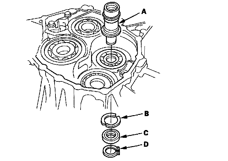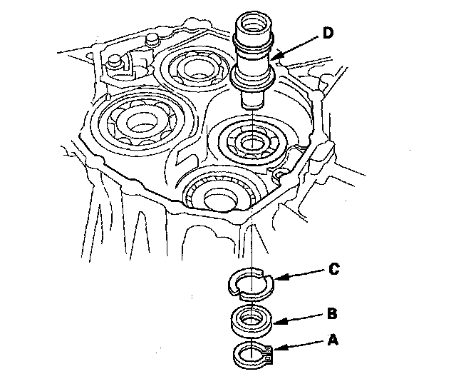 2. To remove the mainshaft bearing (A), the countershaft bearing (B), the secondary shaft bearing (C), and the idler gear shaft bearing (D) from the transmission housing, expand each snap ring with the snap ring pliers, then push the bearing out.