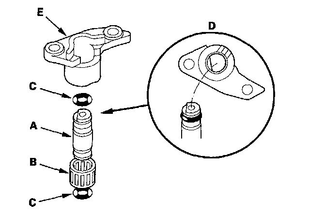2. Assemble the new O-rings and the needle bearing on the reverse idler gear shaft, then install the reverse idler gear shaft in the reverse idler gear shaft holder (E). Align the D-shaped cut out of the shaft with the D-shaped area of the holder.