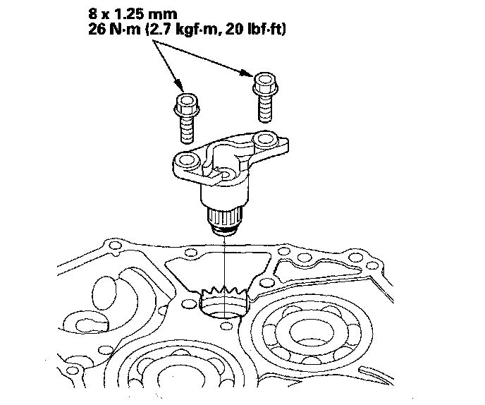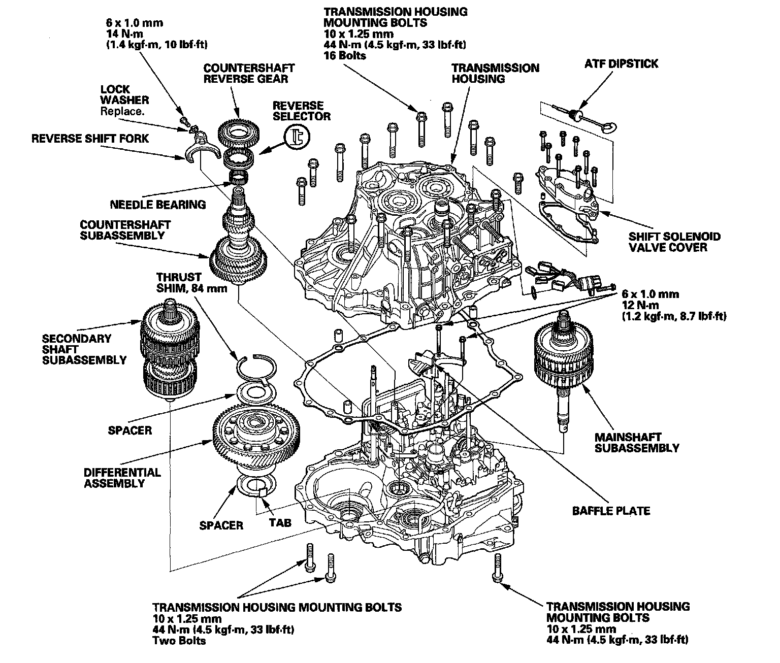 17. Install the transmission housing mounting bolts from the torque converter housing side, and tighten the three bolts to 44 Nm (4.5 kgf-m, 33 lbf-ft).