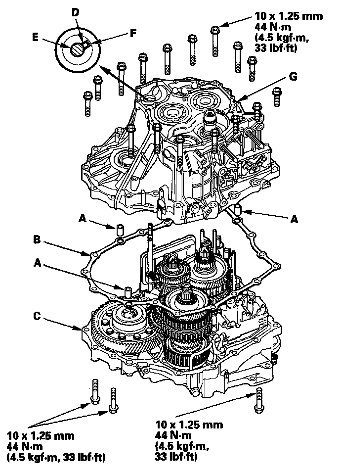 16. Install the transmission housing mounting bolts, and tighten the 16 bolts to 44 Nm (4.5 kgf-m, 33 lbf-ft) in at least two steps in a crisscross pattern.