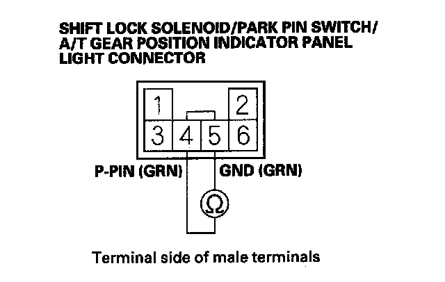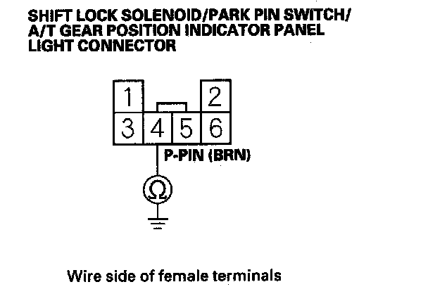 8. Check for continuity between shift lock solenoid/park pin switch/A/T gear position indicator panel light connector terminal No. 4 and body ground.