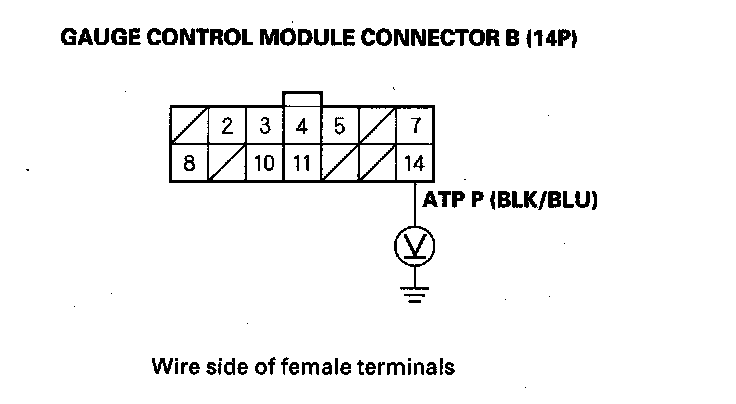 14. Measure the voltage between gauge control module connector terminal B14 and body ground.