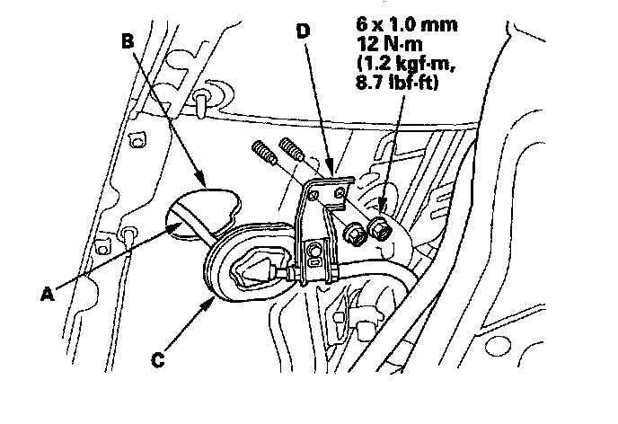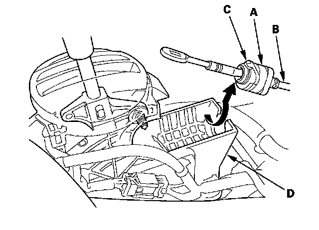 5. Rotate the socket holder (A) on the shift cable (B) a quarter turn; the tab (C) on the socket holder will be in the opening of the shift lever bracket base (D). Then slide the holder to remove the shift cable from the shift lever bracket base.