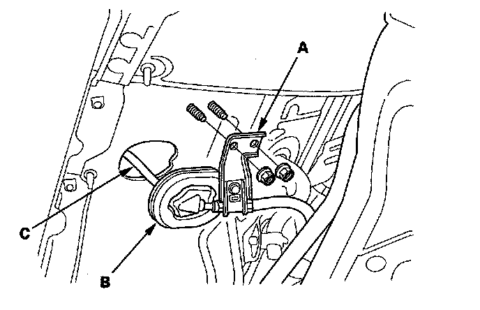 7. Remove the shift cable bracket (A) and the grommet (B), then pull the shift cable (C) out through the hole in the body.