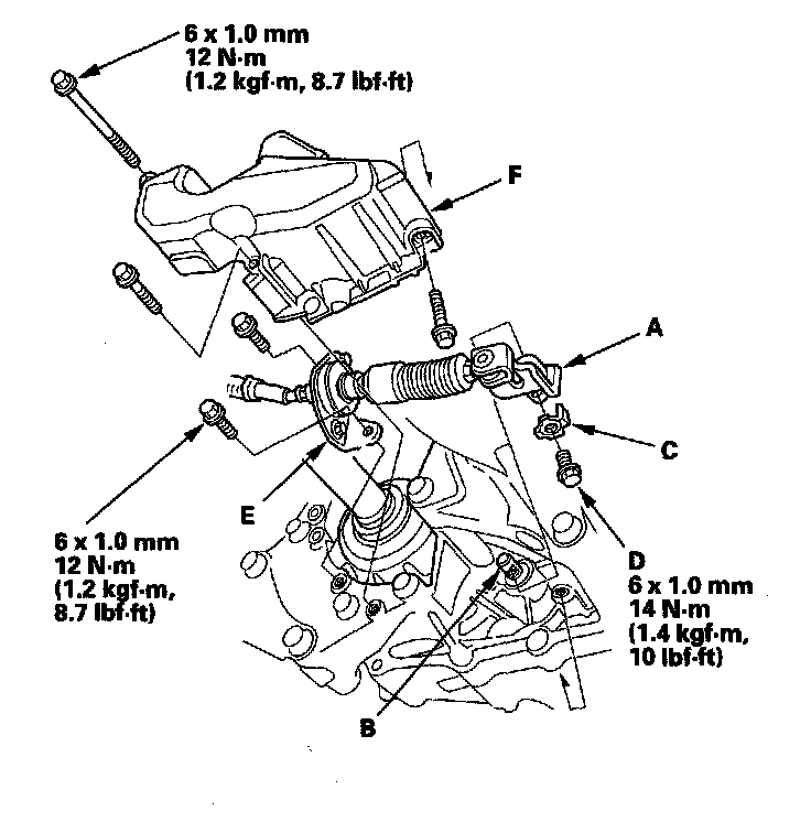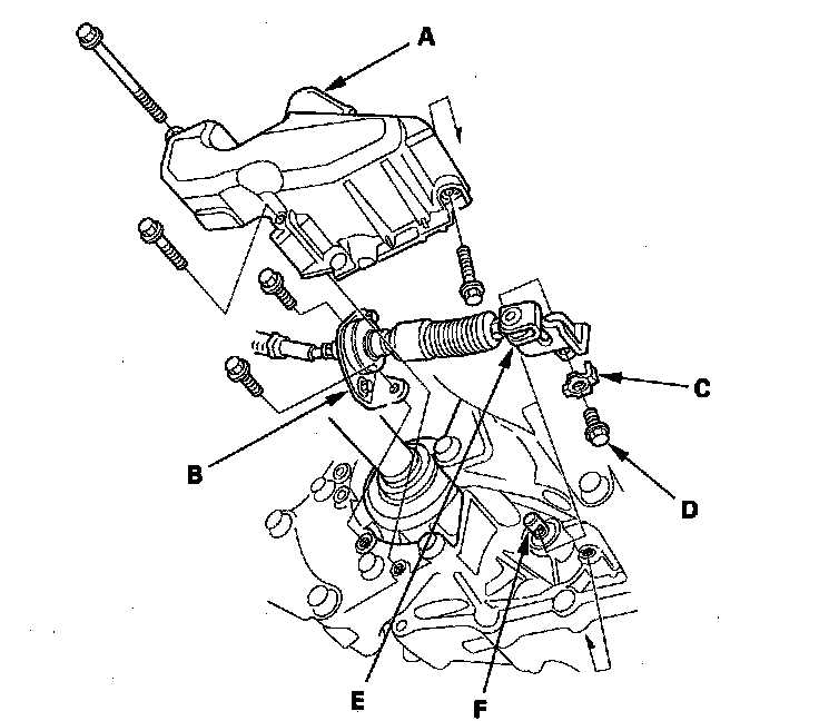 9. Pry up the lock tab of the lock washer (C), and remove the lock bolt (D) and the lock washer, then separate the shift cable (E) from the selector control shaft (F).