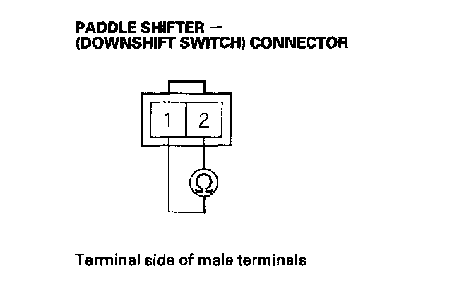 4. Check for continuity between paddle shifter - (downshift switch) connector terminals while pressing the paddle shifter - and when the paddle shifter - is released,
