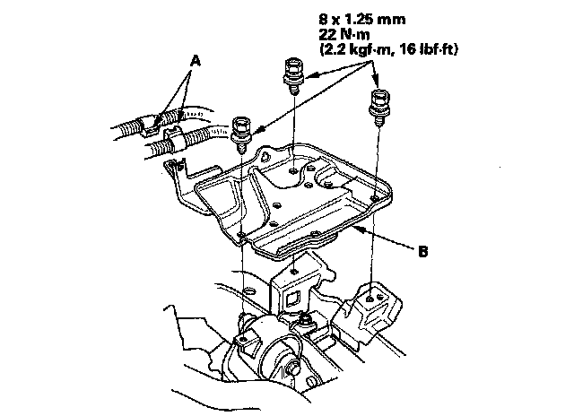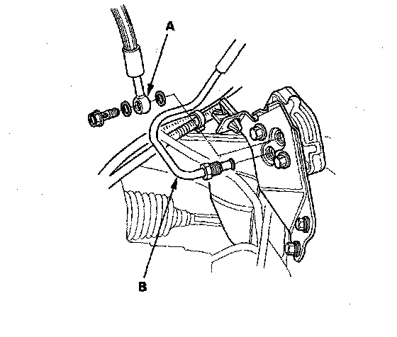 6. Disconnect the clutch hose (A) and clutch pipe (B). Plug or wrap the end of the clutch line with a shop towel to prevent brake fluid from coming out.