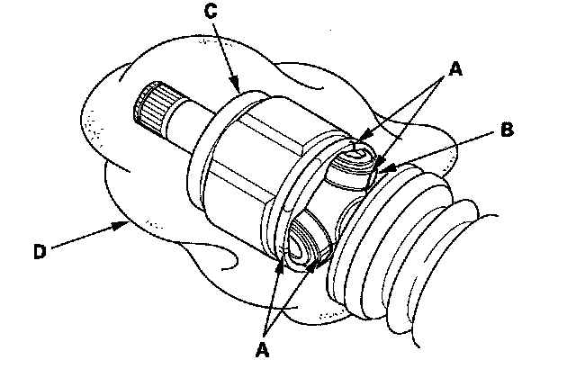 3. Make marks (A) on each roller (B) and inboard joint (C) to identify the locations of rollers and grooves in the inboard joint. Then remove the inboard joint on the shop towel (D). Be careful not to drop the rollers when separating them from the inboard joint.