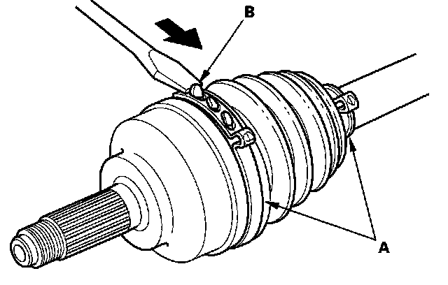 1. Remove the boot bands. Be careful not to damage the boot and dynamic damper. Lift up the three tabs (B) with a screwdriver.