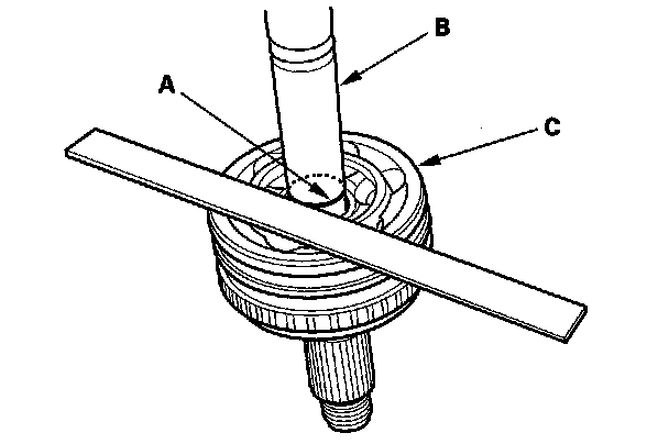 4. Make a mark (A) on the driveshaft (B) at the same level as the outboard joint rim (C).