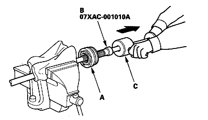 6. Remove the outboard joint (A) using the 22 x 1.5 mm threaded adapter (B) and a commercially available 5/8"-18 UNF slide hammer (C).