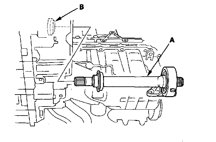 2. Use solvent or brake cleaner to thoroughly clean the areas where the intermediate shaft (A) contacts the transmission (differential), and dry with compressed air. Insert the intermediate shaft assembly into the differential. Insert the intermediate shaft horizontally to prevent damaging the differential oil seal (B).
