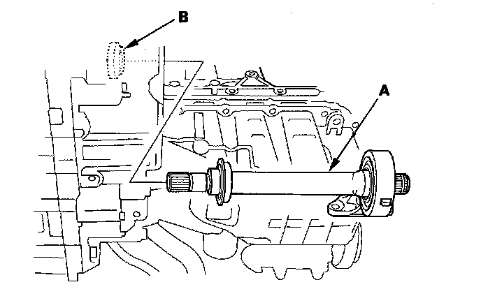 5. Remove the intermediate shaft (A) from the differential. Hold the intermediate shaft horizontally until it is clear of the differential to prevent damaging the differential oil seal (B).