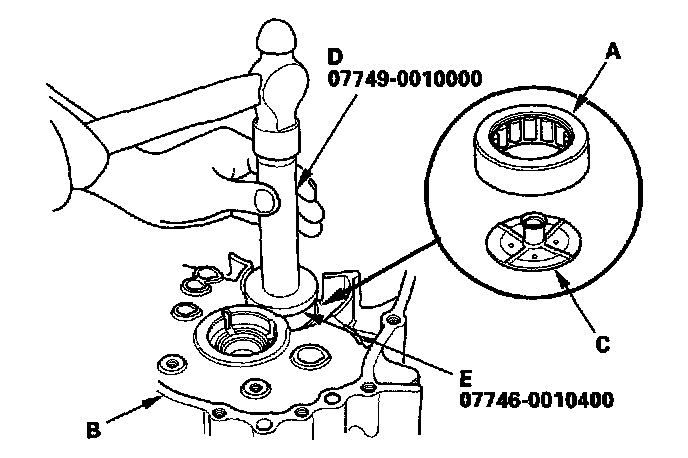 3. Install the needle bearing using the driver (D) and 52 x 55 mm attachment (E).