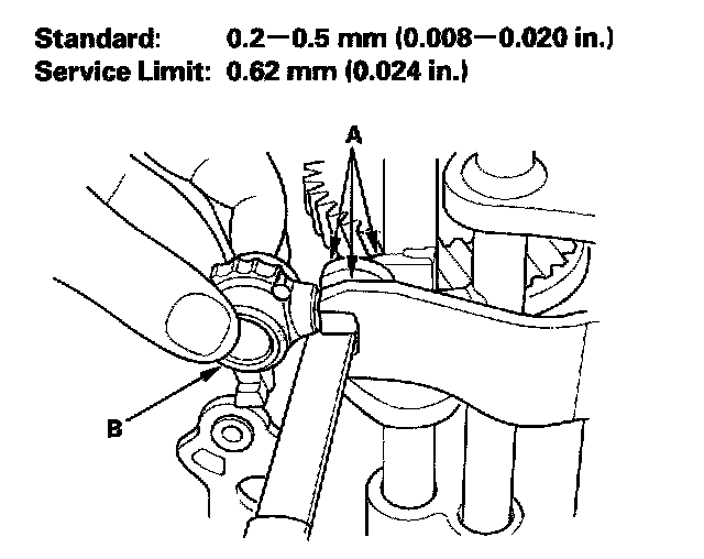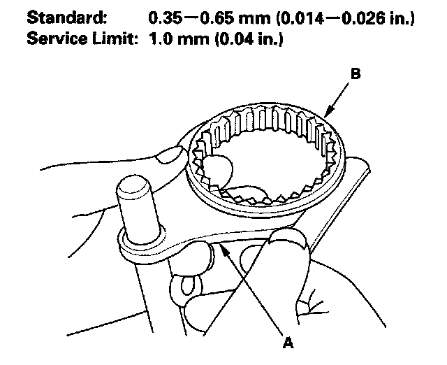 1. Measure the clearance between each shift fork (A) and its matching synchro sleeve (B). If the clearance exceeds the service limit, go to step 2.