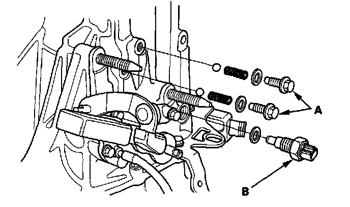 1. Remove the set screws (A), 12 mm washers, springs, steel balls and back-up light switch (B).