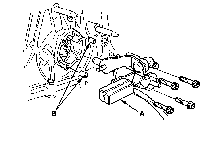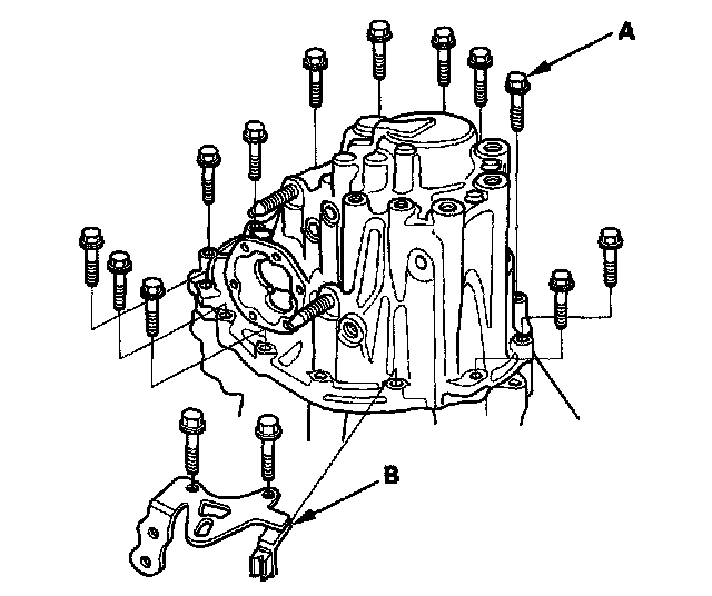 4. Remove the 8 mm flange bolts (A) and transmission hanger (B) in a crisscross pattern in several steps.