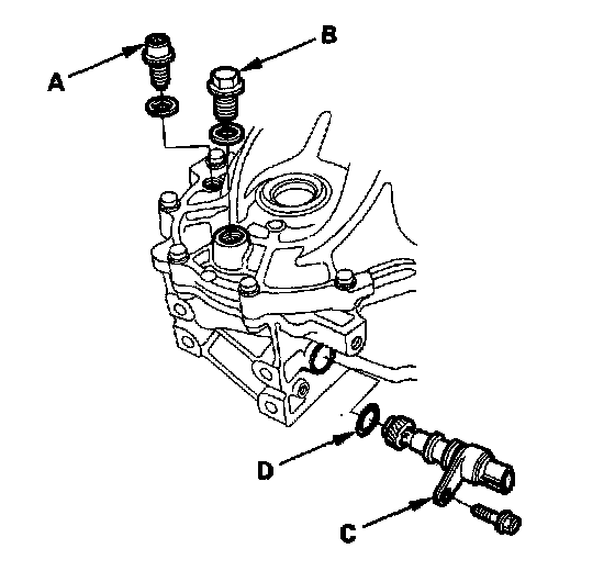 3. Remove the drain plug (A), filler plug (B), vehicle speed sensor (VSS) (C) and O-ring (D).