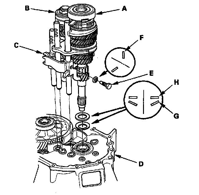 11. Apply tape to the mainshaft splines to protect the seal, then remove the mainshaft assembly (A) and countershaft assembly (B) with the shift fork assembly (C) from the clutch housing (D).