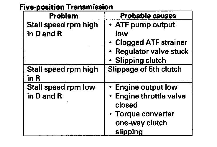 9. If the stall speed measurements are out of the service limit, refer to the problems and probable causes listed in the table.