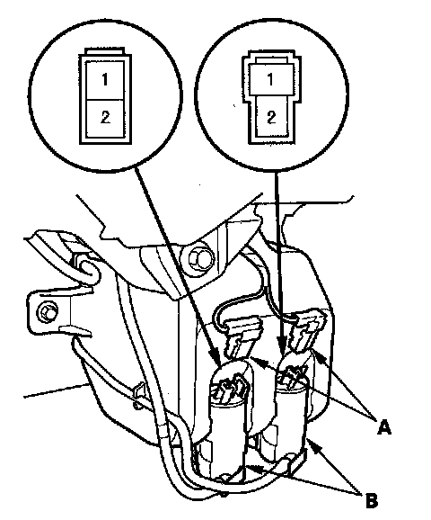 3. Test the motor by connecting battery power to the No. 1 terminal and ground the No. 2 terminal of the washer motor. The motor should run.