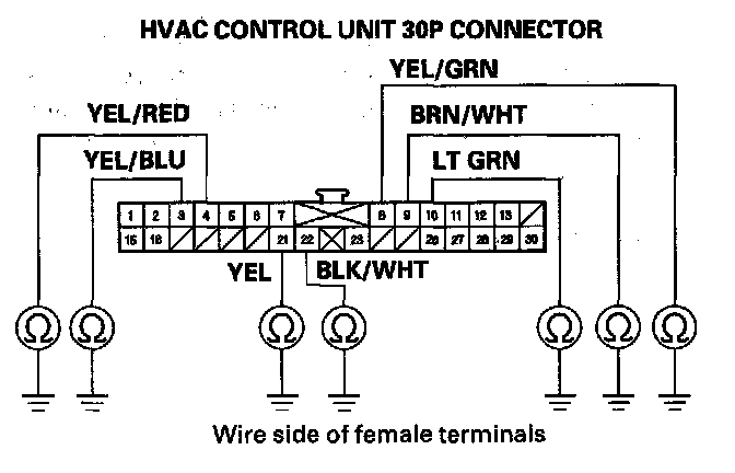 4. Check for continuity between body ground and the heater control panel 30P connector No. 3, 4, 8, 9, 10, 21, and 22 terminals individually.