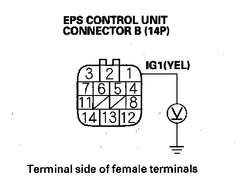 4. Measure the voltage between EPS control unit connector B (14P) terminal No. 1 and body ground.