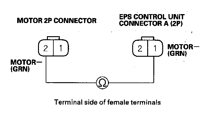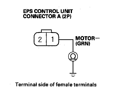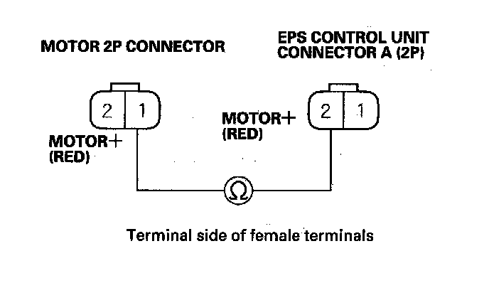 5. Check for continuity between EPS control unit connector A (2P) terminal No. 1 and motor 2P connector terminal No. 2.