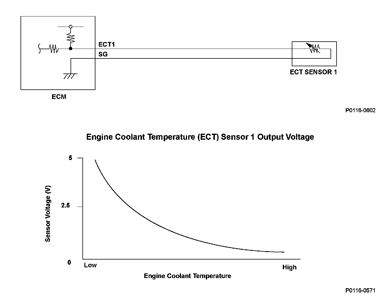 The engine coolant temperature (ECT) sensor 1 is used for air fuel ratio feedback control, ignition timing control, idle speed control, and other functions. The ECT sensor 1 resistance varies depending on the engine coolant temperature. As the engine coolant cools, the ECT sensor 1 resistance increases, and the engine control module (ECM) detects a high signal voltage. As the engine coolant warms, the ECT sensor 1 resistance decreases, and the ECM detects a low signal voltage. If the ECT sensor 1 output voltage is more than a set value when the engine coolant temperature is low, the ECM detects a malfunction and a DTC is stored.