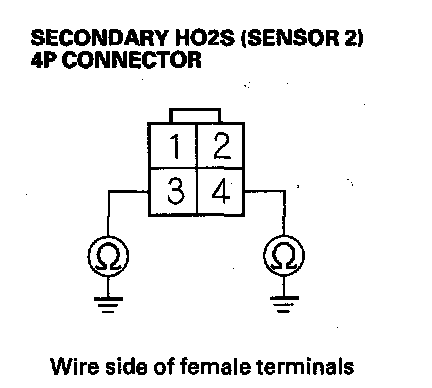 9. At the secondary HO2S (Sensor 2) side, check for continuity between body ground and secondary HO2S (Sensor 2) 4P connector terminals No. 3 and No. 4 individually.